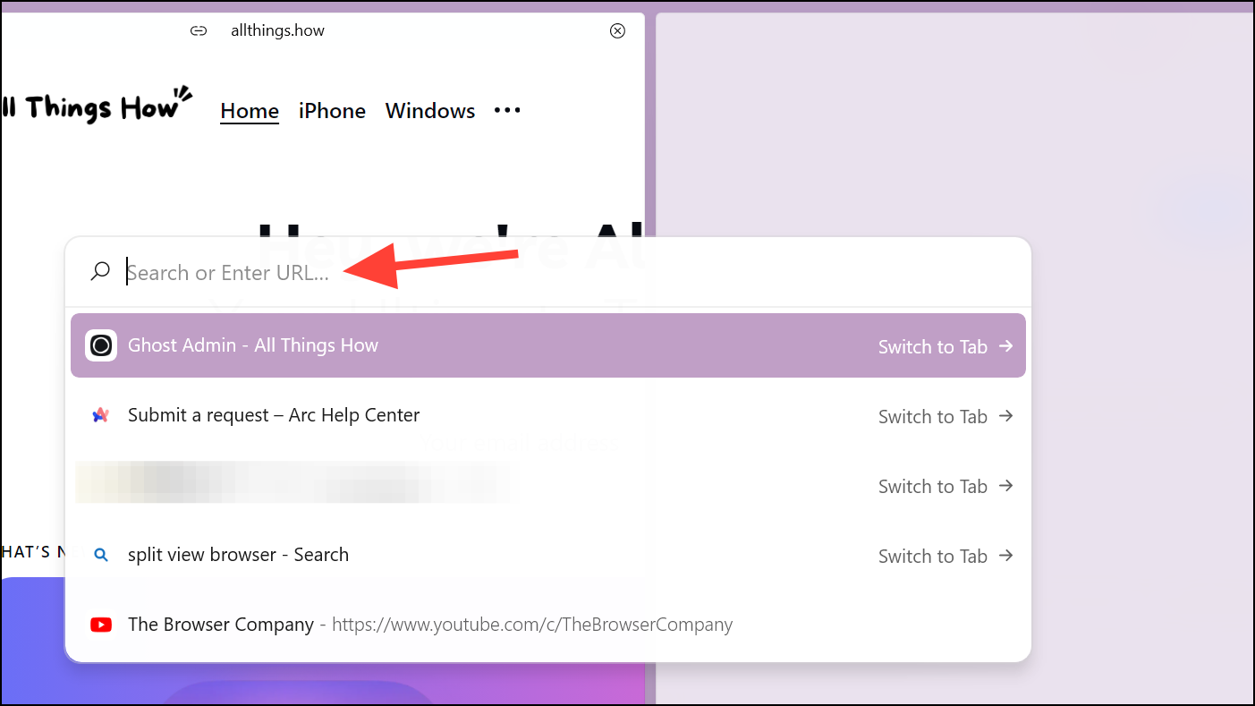 - Next, enter the URL or search for the website you want to add to Split View. If it's already open, it might appear in suggestions below the command bar; click on it.