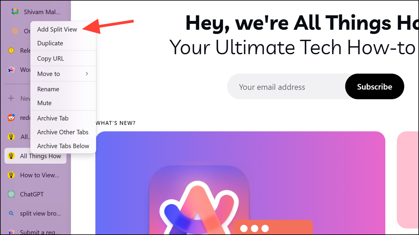- Alternatively, you can right-click on a tab from the sidebar and select 'Add Split View' from the context menu. Then, add the other tab to it.