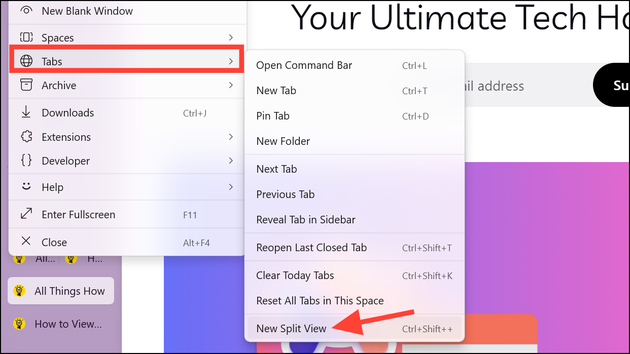 - Then, go to 'Tabs' from the menu and select 'New Split View' from the sub-menu.