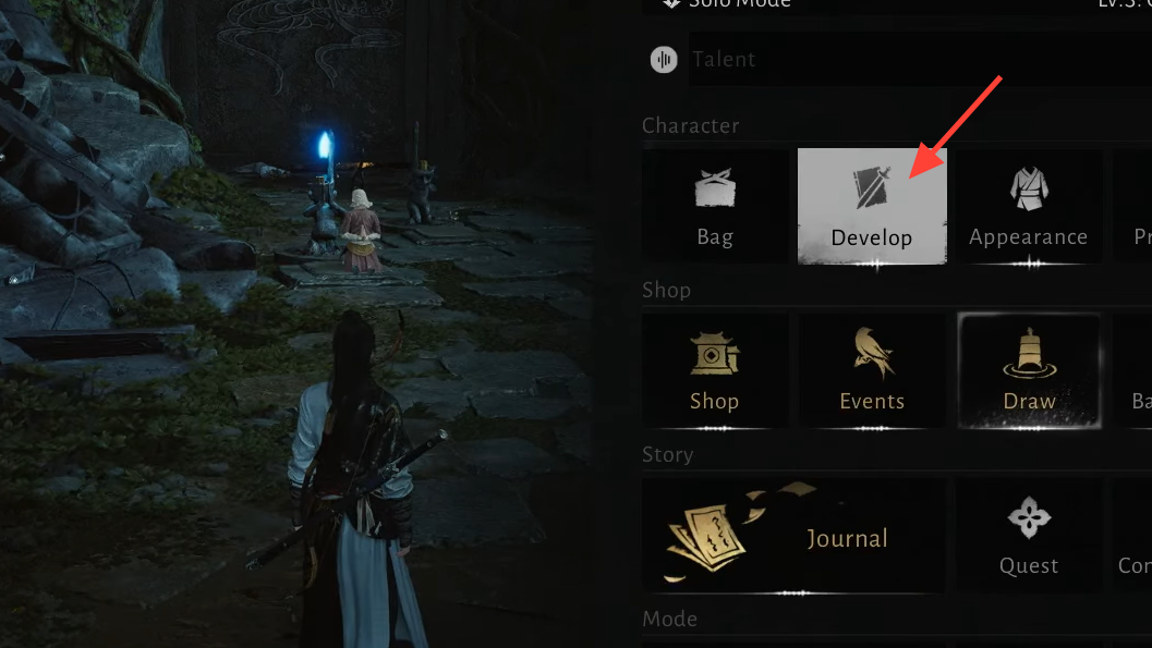 Step 1: Open the menu and go to the Develop tab. Enter the skills area so you can change what’s currently equipped.