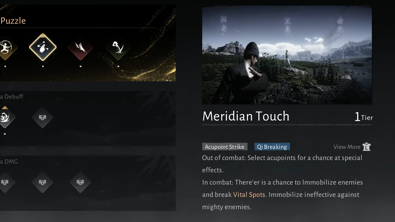 Step 2: Navigate to Mystic Skills and find Meridian Touch under the puzzle-focused set (shown as a Puzzles tab/sub-tab). Assign it to a slot you can use in the field.