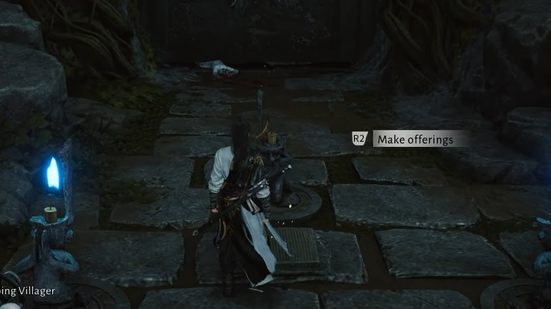 Step 4: Return to the central statue and use the Make Offering / Worship interaction. With both worshippers locked in place, the mechanism triggers, and the stone door opens so you can continue into the cave.