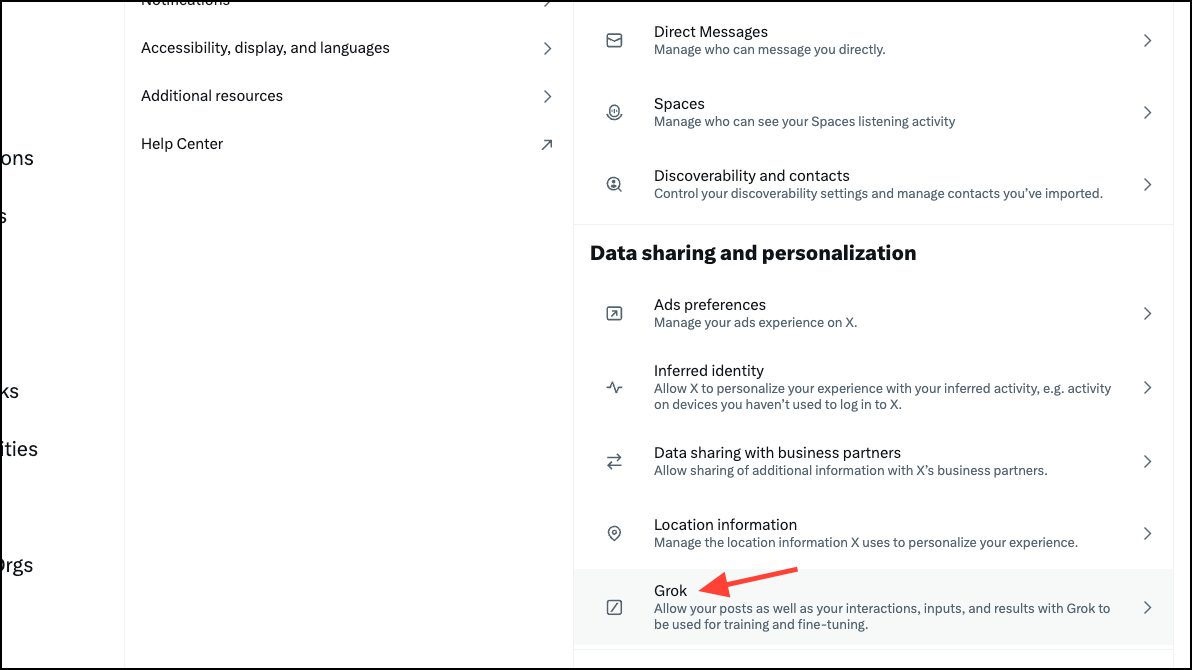 - Scroll down slightly and click on 'Grok' under the 'Data Sharing and Personalization' section.
