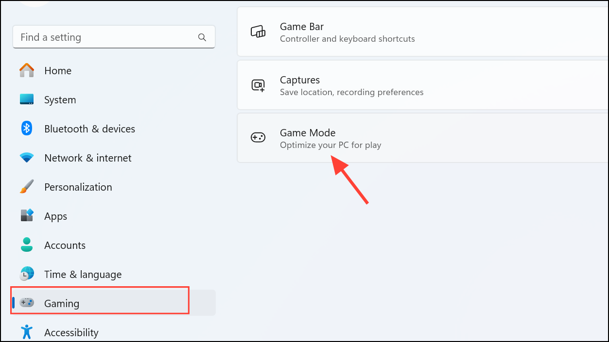 Step 2: Navigate to "Gaming" in the left-hand menu, then click "Game Mode."