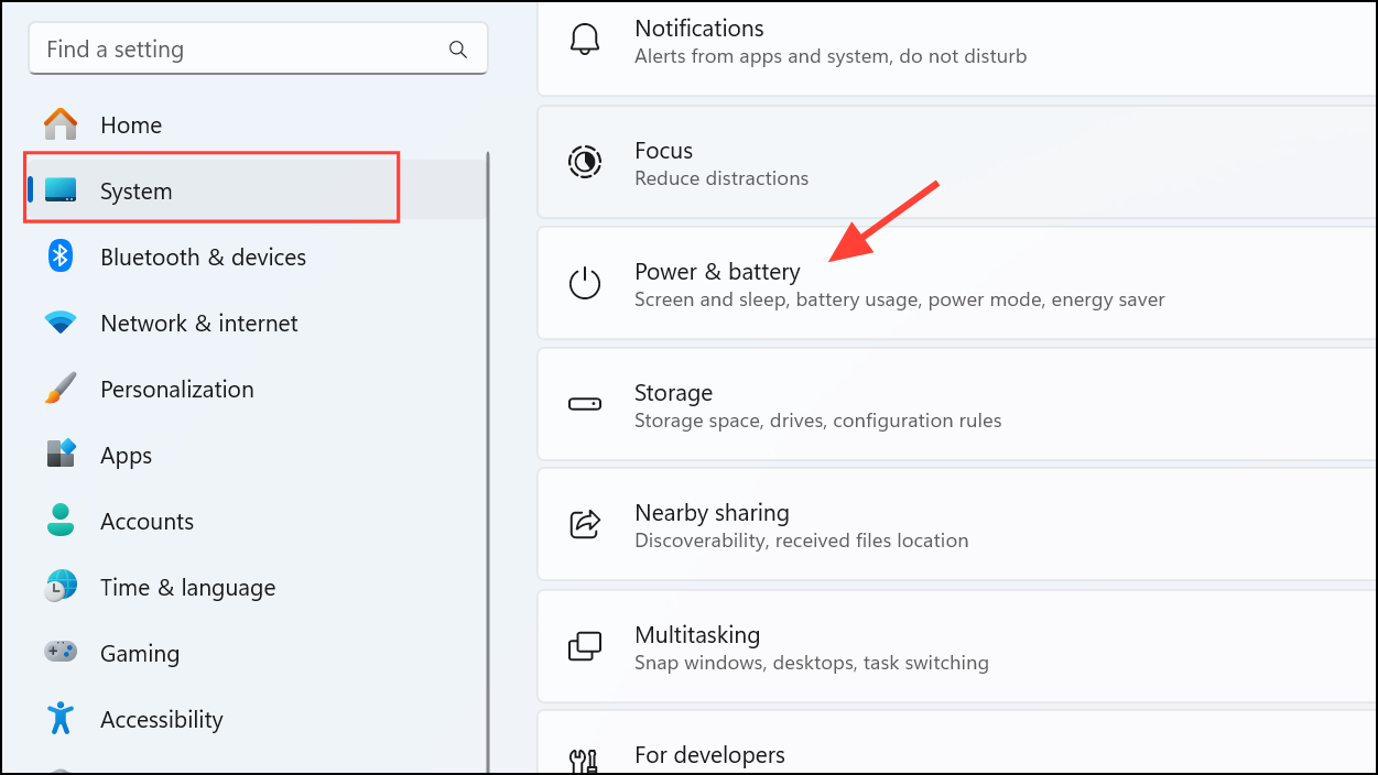 Step 2: Select "System" from the sidebar, then click "Power" (on desktop PCs) or "Power & Battery" (on laptops).