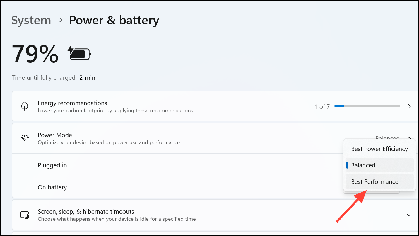 Windows 11 typically uses a balanced power mode by default, which limits performance to conserve energy. Switching to the "Best Performance" mode ensures maximum CPU and GPU performance, crucial for gaming.