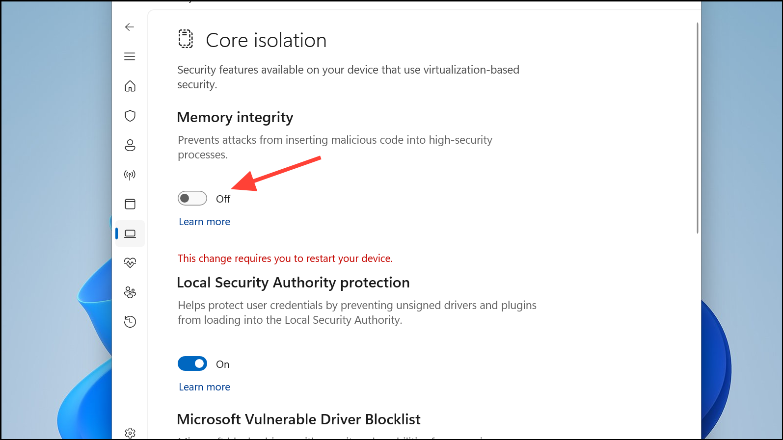 Step 3: Open the Core Isolation settings and toggle the "Memory Integrity" setting to "Off."