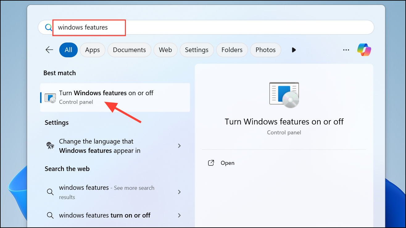 Step 1: Open the Start menu and search for "Windows features."