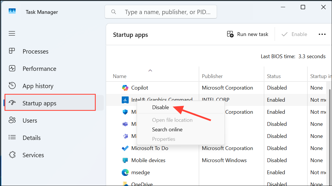 Step 3: Identify any unnecessary apps, right-click them, and select "Disable."