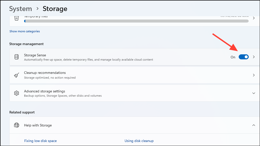 Step 2: Toggle the "Storage Sense" switch to "On." Storage Sense automatically deletes unnecessary temporary files and clears out old files in the Recycle Bin, freeing valuable disk space.