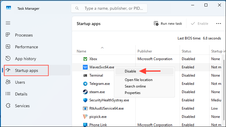 Step 1: Press Ctrl + Shift + Esc to open Task Manager and select the "Startup apps" tab.