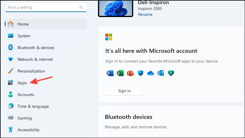 Win + Ishortcut and click on 'Apps' on the left.