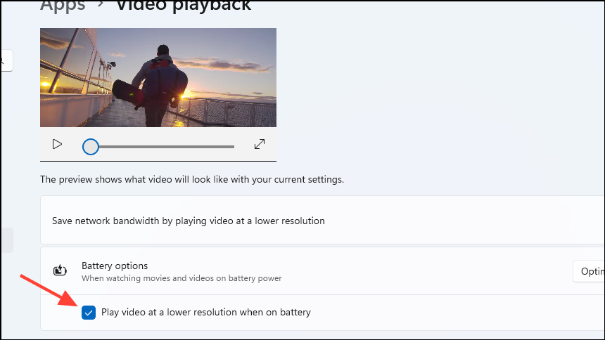 - Alternatively, if you keep this option disabled, you will see another option that lets you save power by lowering the video resolution when your laptop is running on battery. This can also help prevent videos from lagging.