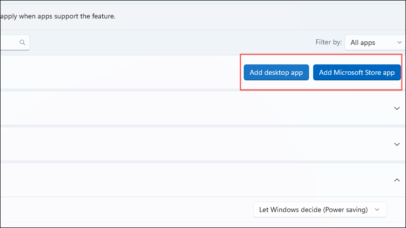 - You can also add additional apps for which you want to adjust the graphics settings by clicking on the 'Add desktop app' or 'Add Microsoft Store app' button at the top. This allows you to add other apps you use to play media and control their graphics settings from here.