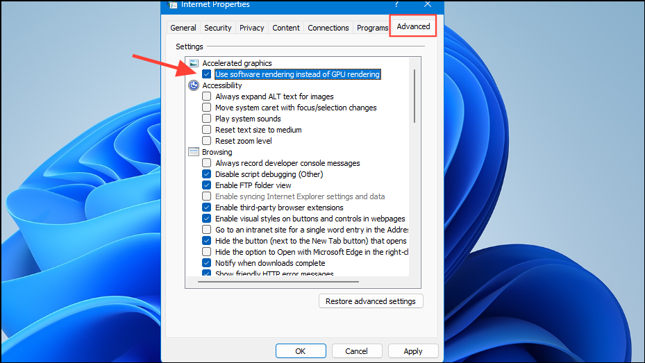 - When the 'Internet Properties' dialog box opens, go to the 'Advanced' tab and click on the 'Use software rendering instead of GPU rendering' checkbox to enable it. Then click on the 'OK' button.