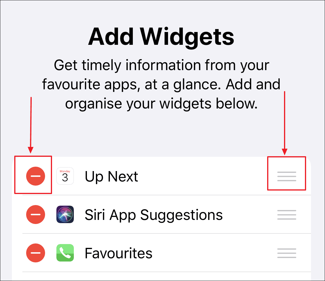You can remove widgets by tapping the minus (-) button, add more widgets by tapping the plus (+) button, and also rearrange them using the bars on the right edge of each widget so they will appear in your preferred order.