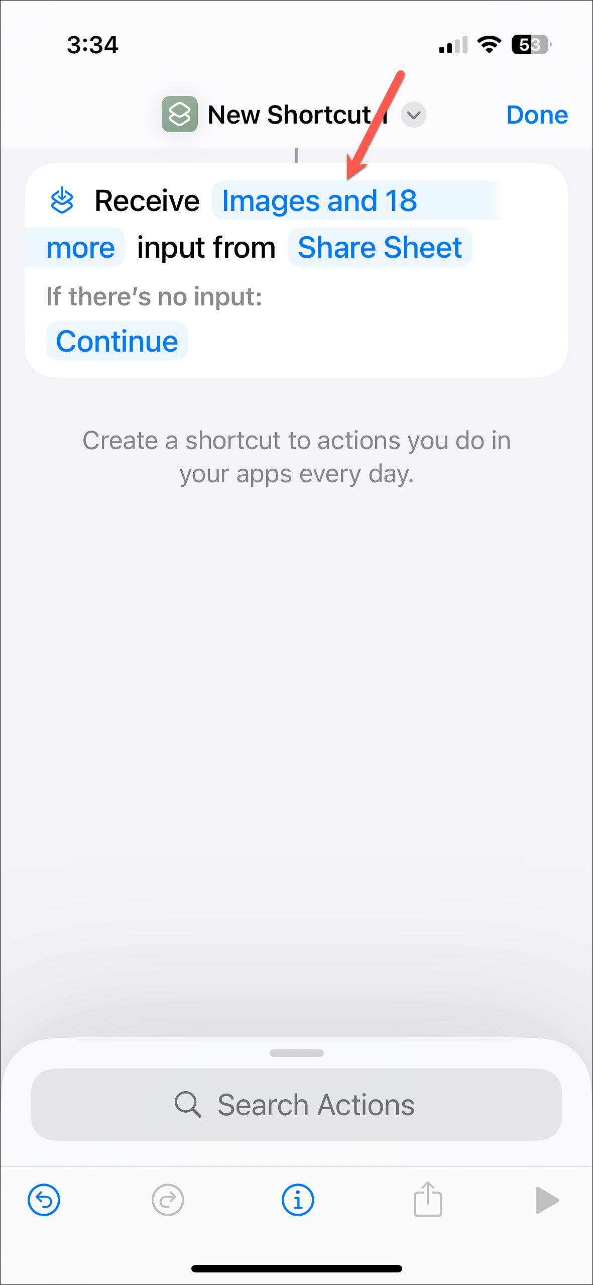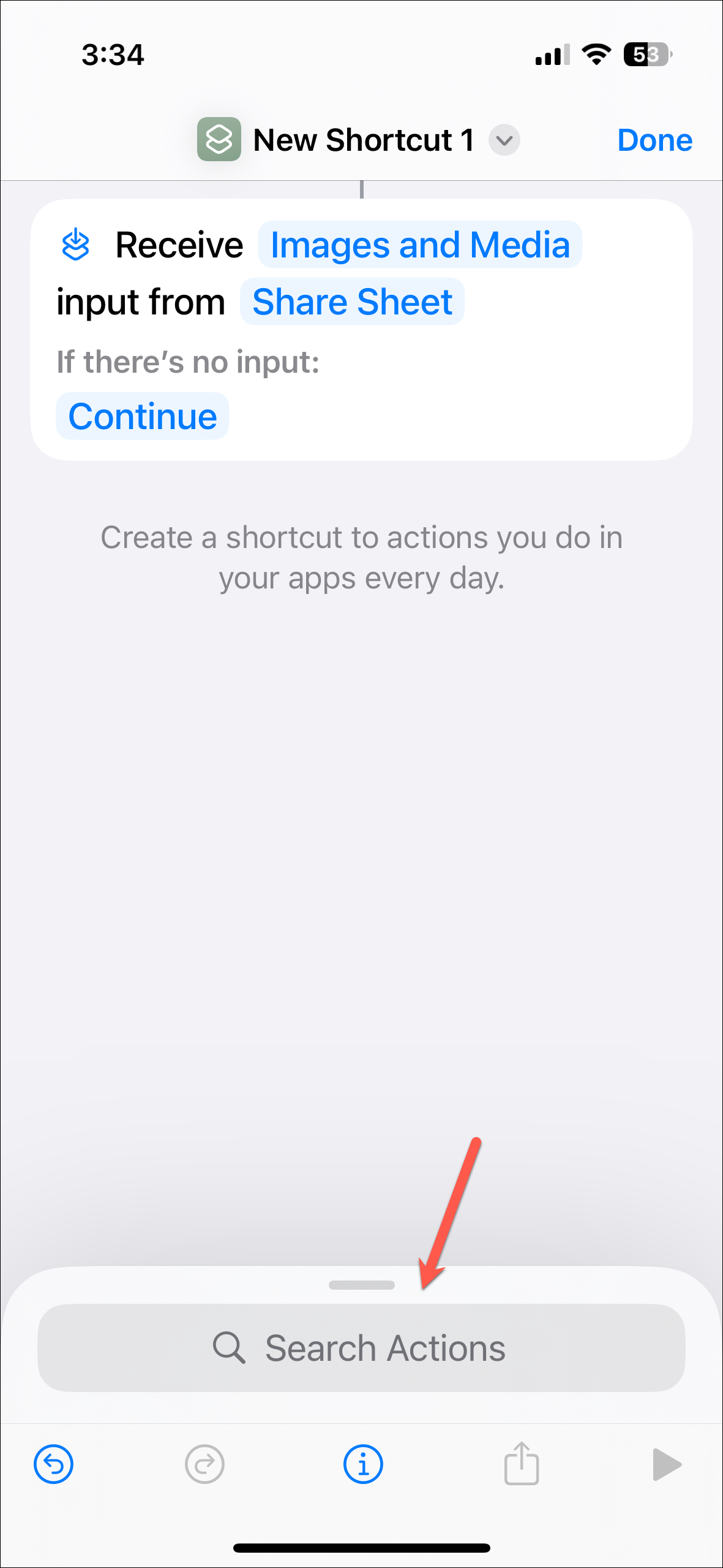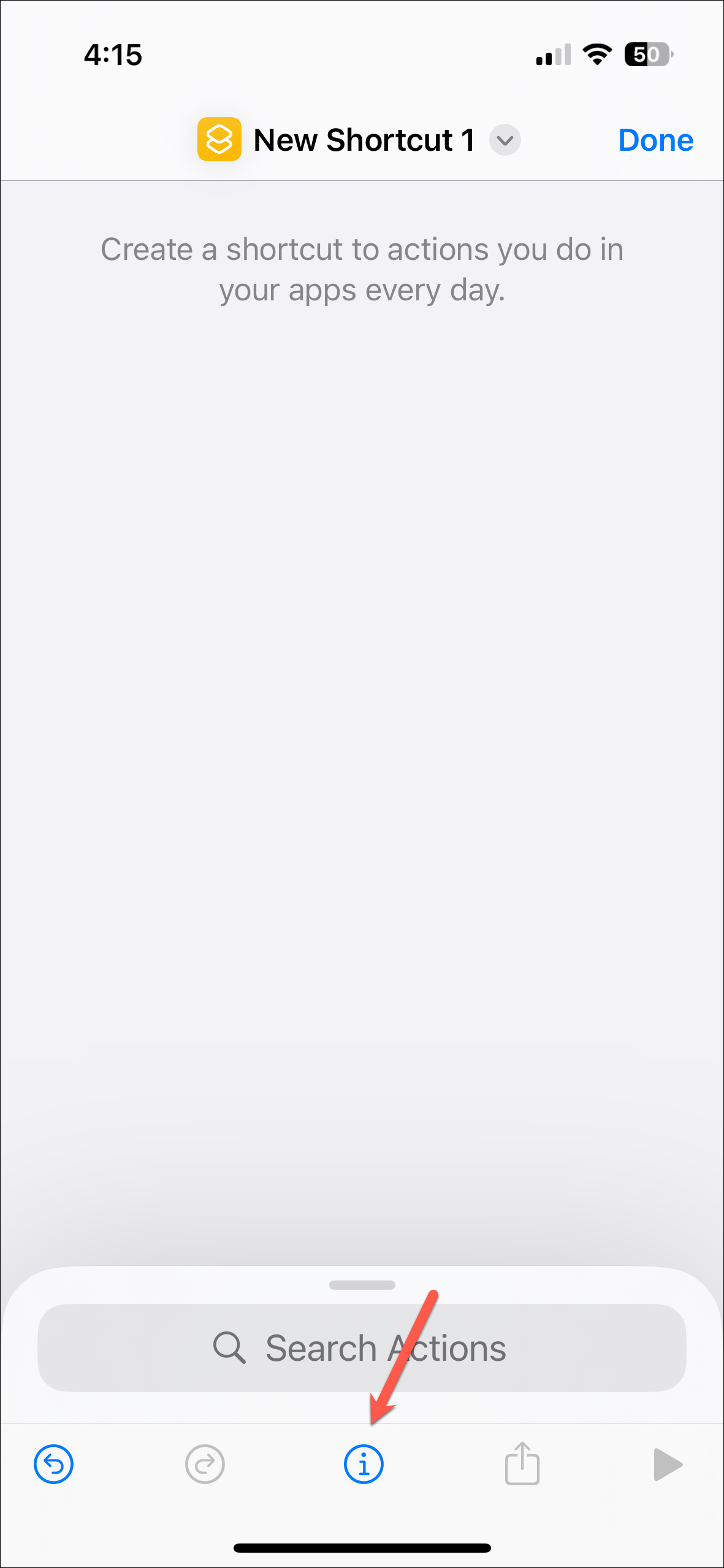 - On the new shortcut page, tap on 'i' on the toolbar at the bottom. (On iOS 18 beta, i.e., the test iPhone, the toolbar didn't appear right away. You first need to add any action, that you can later delete, to get the toolbar, which must be a bug.)