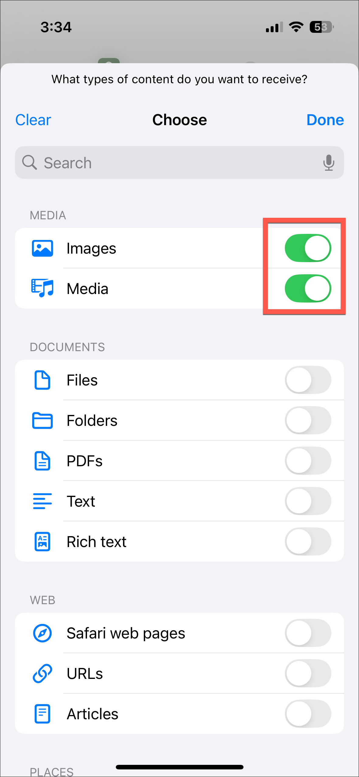 - Then, turn off the toggle for everything except 'Images' and 'Media'. Tap on 'Done' to close this screen.