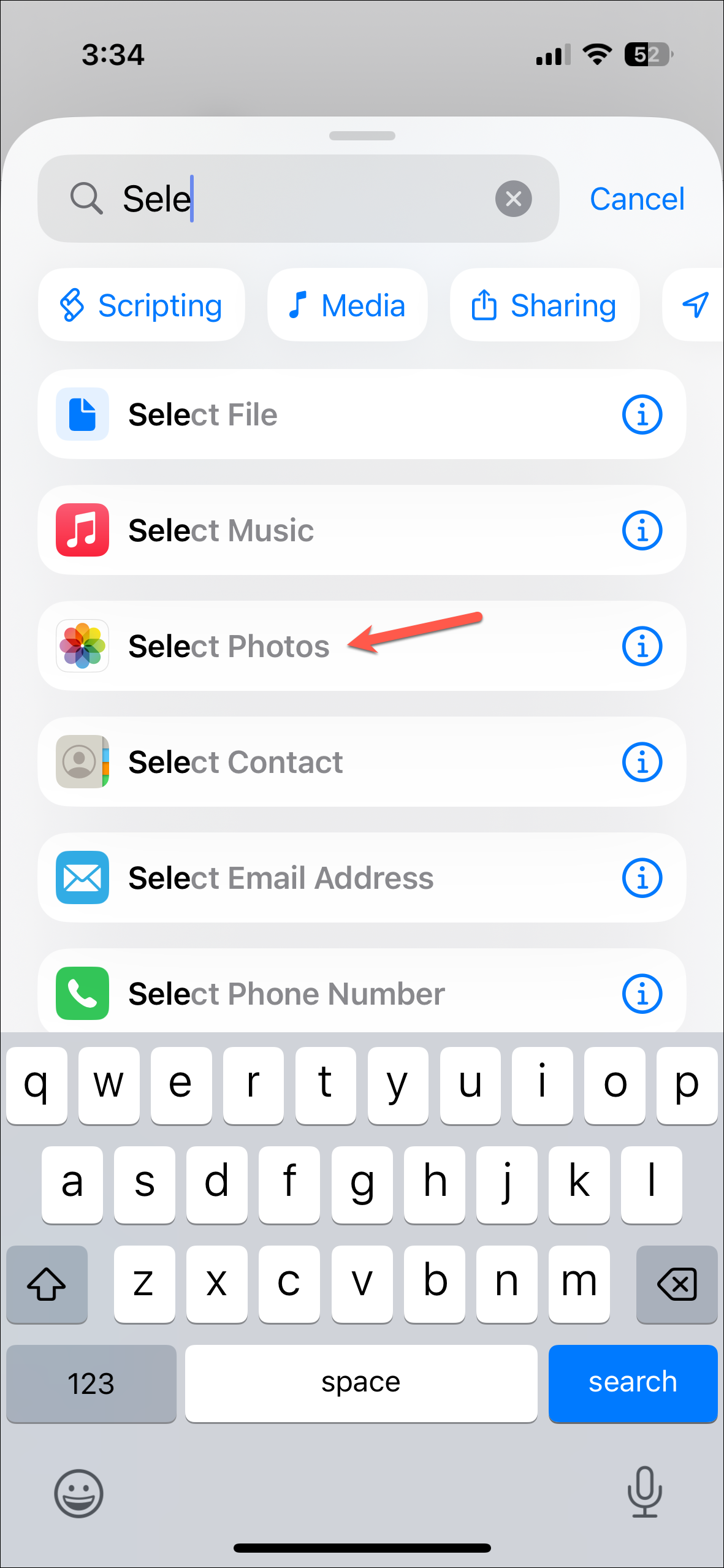 - Type 'Select Photos' in the search bar and tap on it from the results.