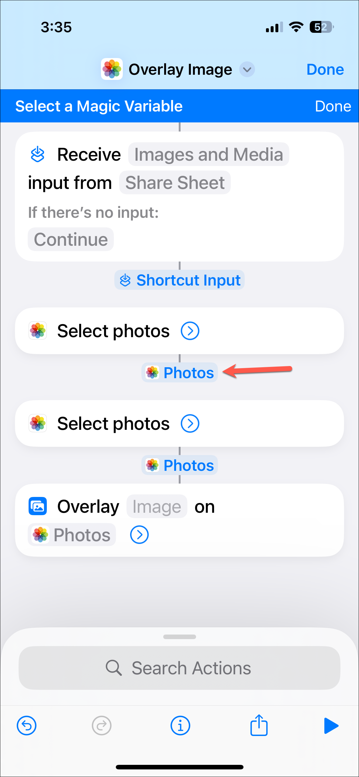 - Now, choose the first 'Photos' output as the magic variable for the overlay action.