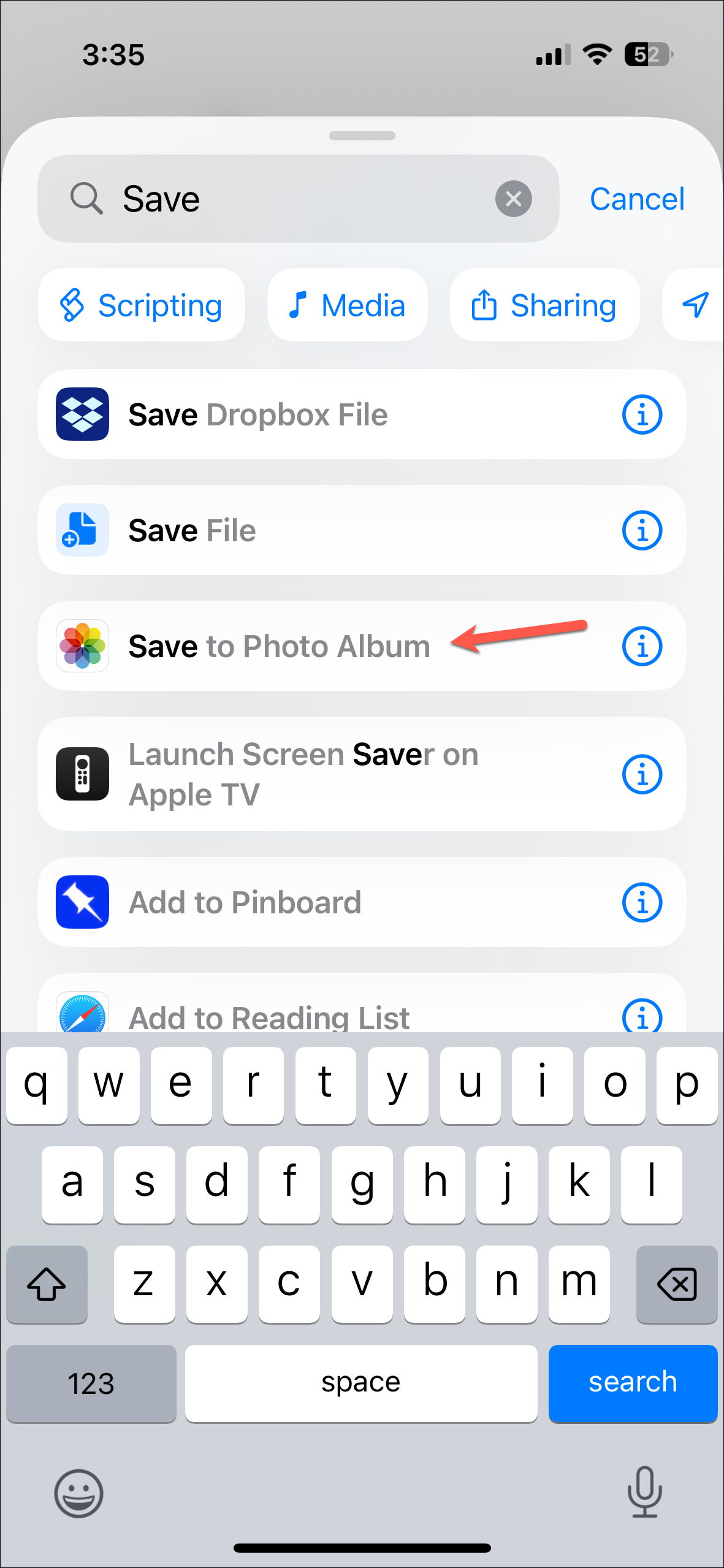 - Next, again go to the Search Actions, search for 'Save to Photo Album', and add that action.