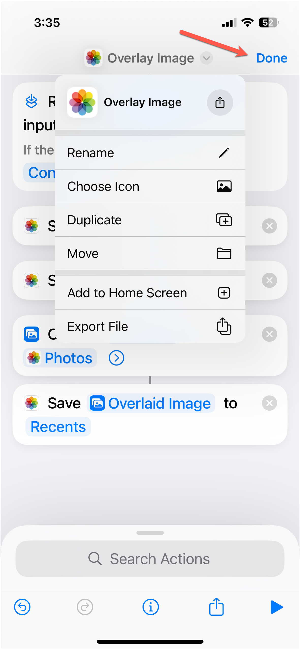 - Finally, rename the shortcut if you want, preferably to something easier to identify like Overlay Image, and tap on 'Done' to save it.