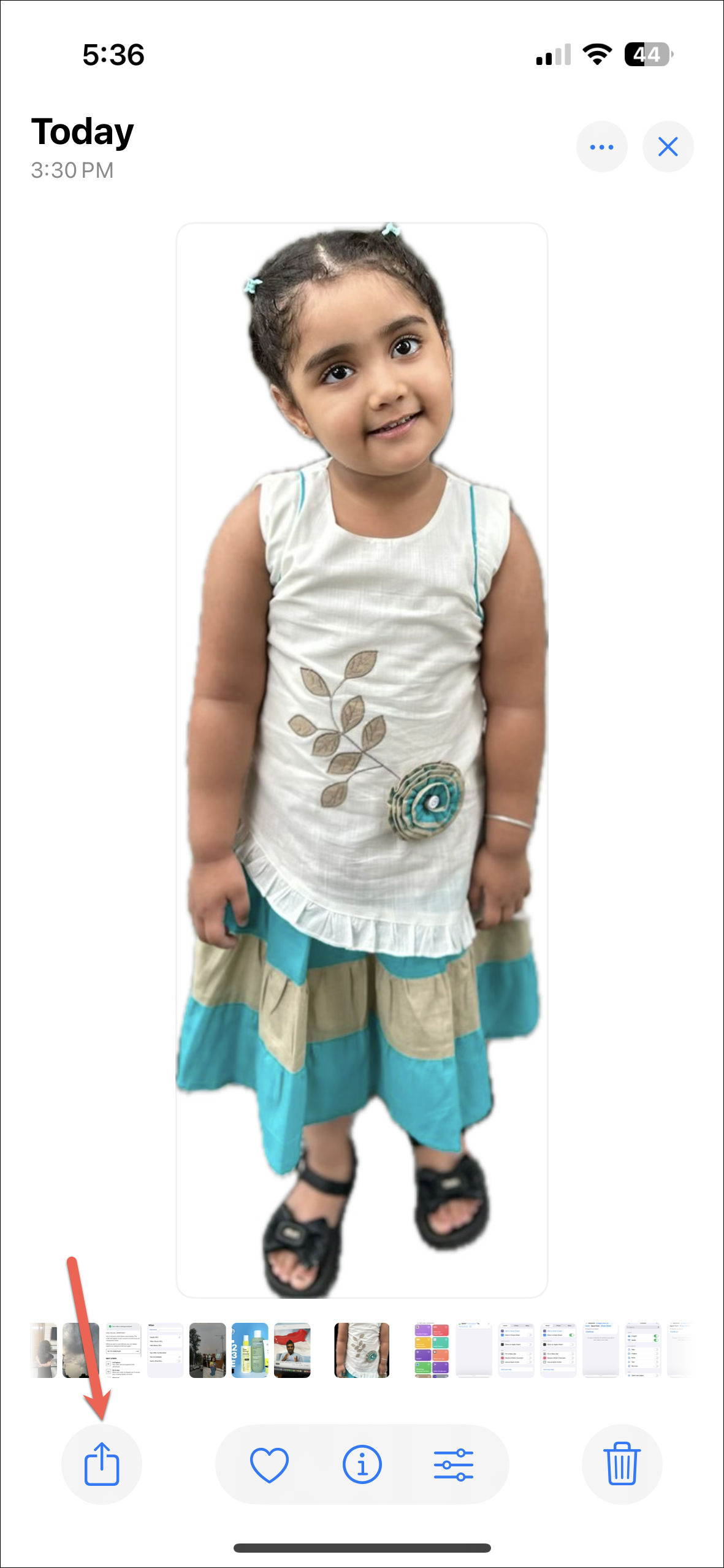 - Go to the 'Photos' app, open any photo, and tap on the 'Share' icon.