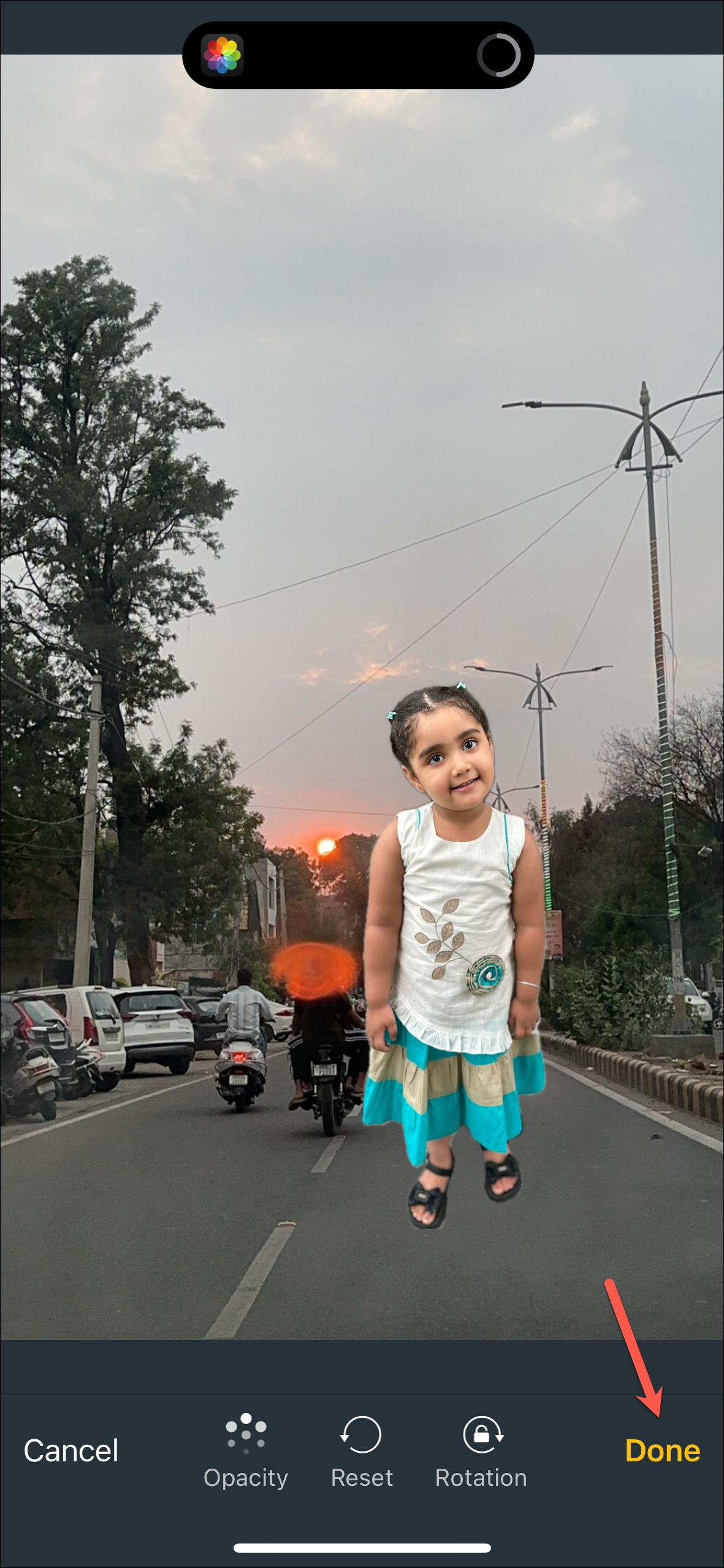 - The first photo will be overlayed on top of the other. You can resize it and adjust the position or use options at the bottom to change the opacity, rotate it, or reset the photo. Tap on 'Done' and it will be saved to your gallery.