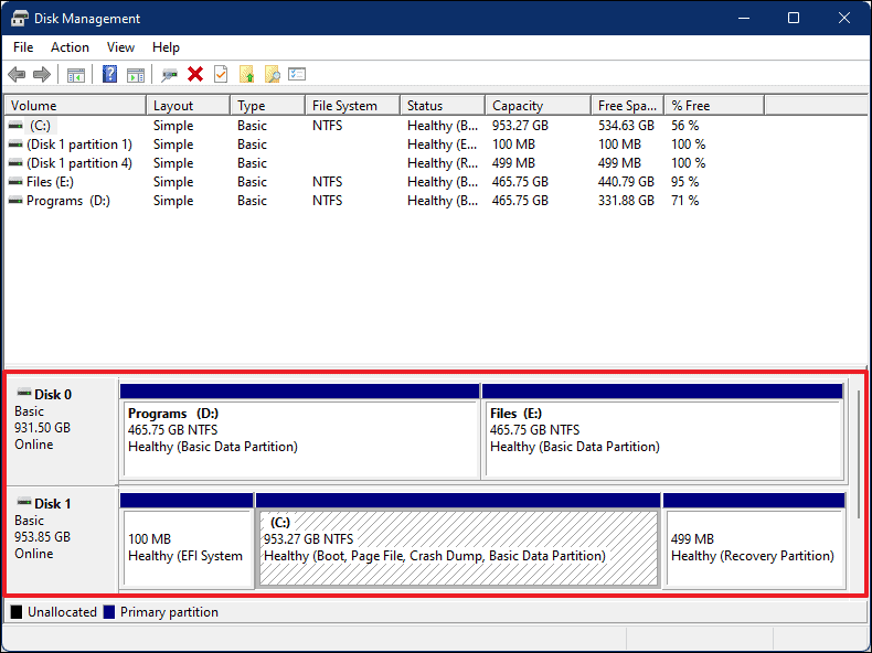 The Disk Management window will open, displaying all your drives and their partitions. Disks are labeled as Disk 0, Disk 1, etc., representing each physical hard drive or SSD in your system.