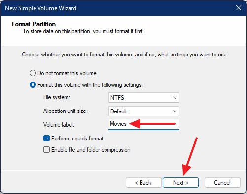 Format the new partition by selecting the file system (usually NTFS) and entering a Volume label to name the partition. Click Next to continue.