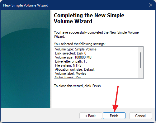 Review your settings and click Finish to create the new partition. The new partition will now appear in both Disk Management and File Explorer.