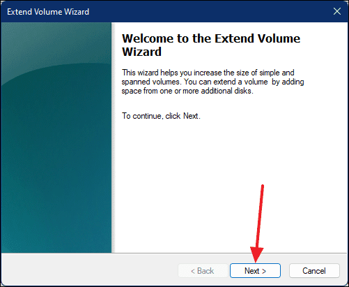 The Extend Volume Wizard will launch. Click Next to proceed.