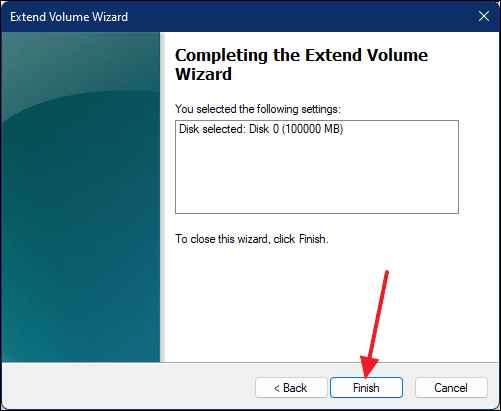 The partition will now include the unallocated space, increasing its size. You can confirm this in the Disk Management window.