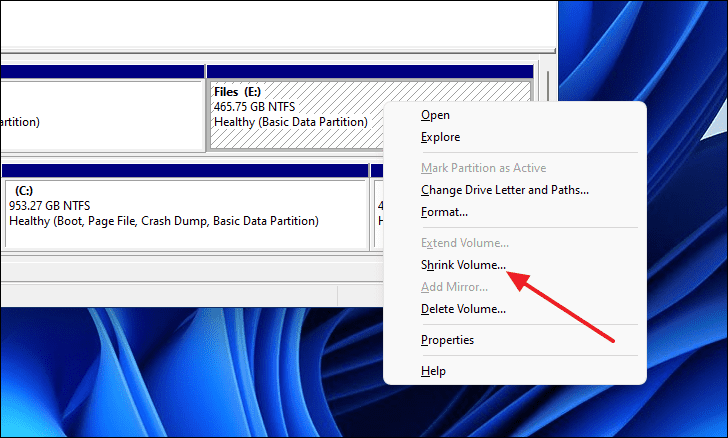 Select the partition you want to shrink by clicking on it—it will be highlighted with a pattern. Right-click the selected partition and choose Shrink Volume... from the context menu.