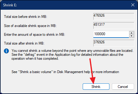 In the Shrink dialog box, enter the amount of space to shrink in megabytes. For example, entering 100000 will shrink the volume by approximately 97.5GB. Click Shrink to proceed.