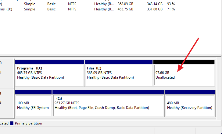 Once the process is complete, you'll see the unallocated space displayed in the Disk Management window.