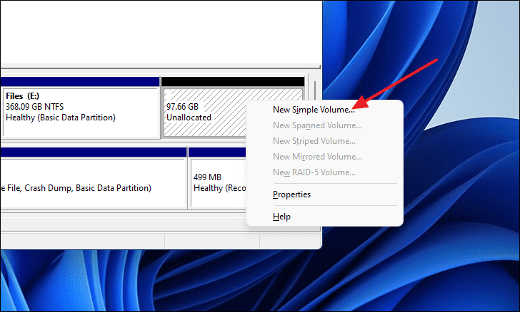 With unallocated space available, you can now create a new partition. Right-click on the unallocated space and select New Simple Volume....