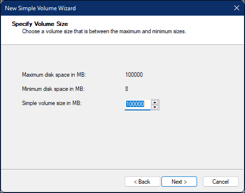 Specify the volume size. By default, it uses the maximum available space. If you want to create multiple partitions from the unallocated space, adjust the volume size accordingly. Click Next when you're ready.