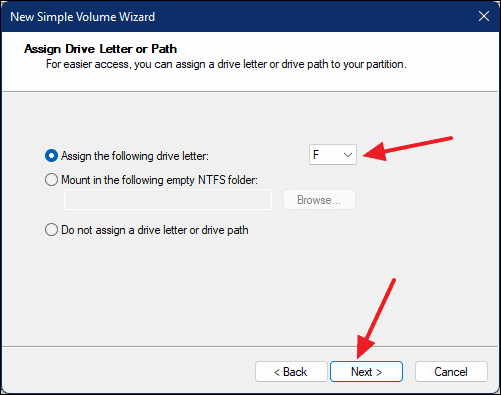 Assign a drive letter of your choice or leave the default selection, then click Next.