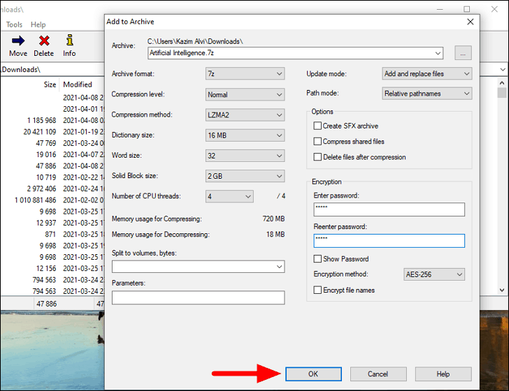 After you have entered the password in both the boxes, click on ‘OK’ at the bottom to create a password-protected zip file.