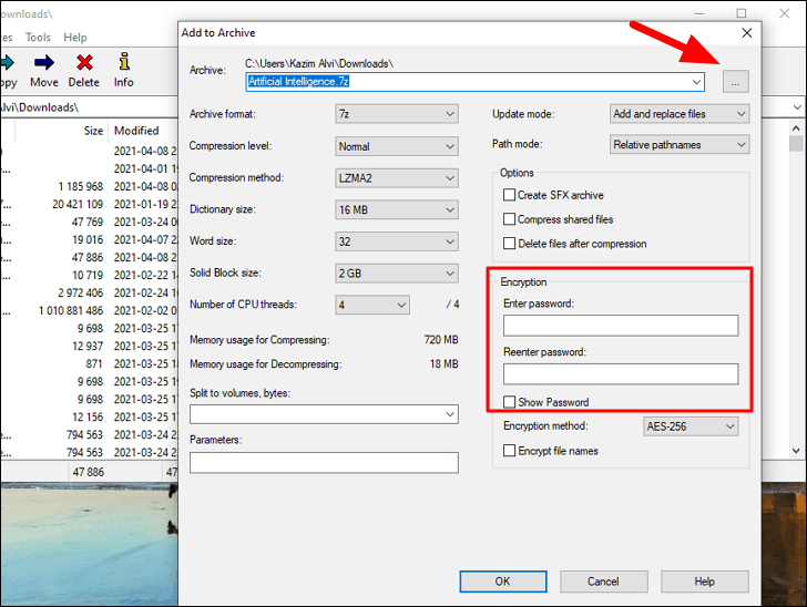 The ‘Add to Archive’ window will now open where you can change the various settings for the zip file. The zip file that is created is by default added to the same folder as the original file. However, you can change it by clicking on the icon with three dots, next to the file name.