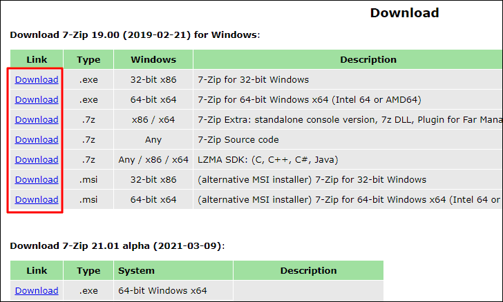 The program is available on the official website and can be downloaded from there. Visit 7-zip.org/download and get the version that’s compatible with your system. There are various download options available on the website to cater to every user. After you have found the one compatible with your system, click on the ‘Download’ icon in the ‘Link’ column. Once the file is downloaded, you can easily install it by following the instructions.