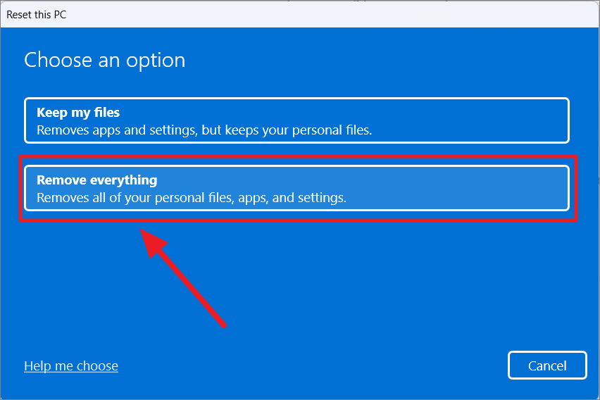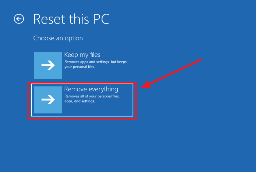 Step 4: A window will appear with two options. Choose 'Remove everything' to erase all personal files, apps, and settings.