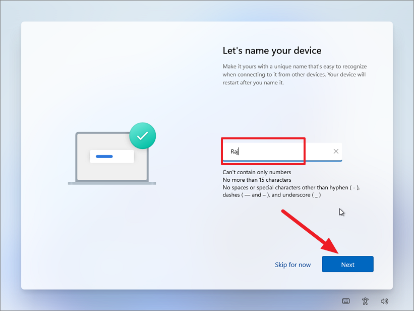 Step 4: Windows will check for updates. Once completed, enter a name for your PC and click 'Next'.