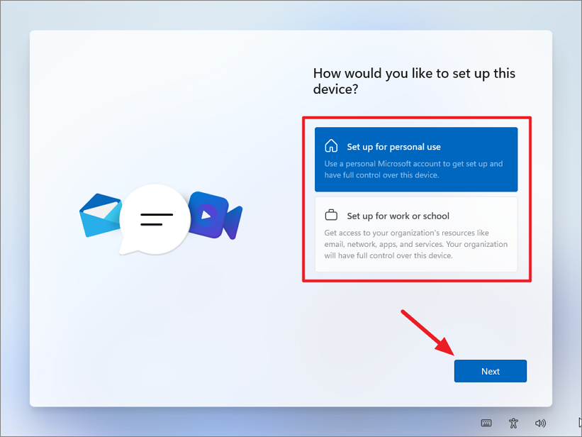 Step 6: For Windows 11 Pro, choose 'Set up for personal use' or 'Set up for work or school' based on your needs. Windows 11 Home users will proceed automatically.