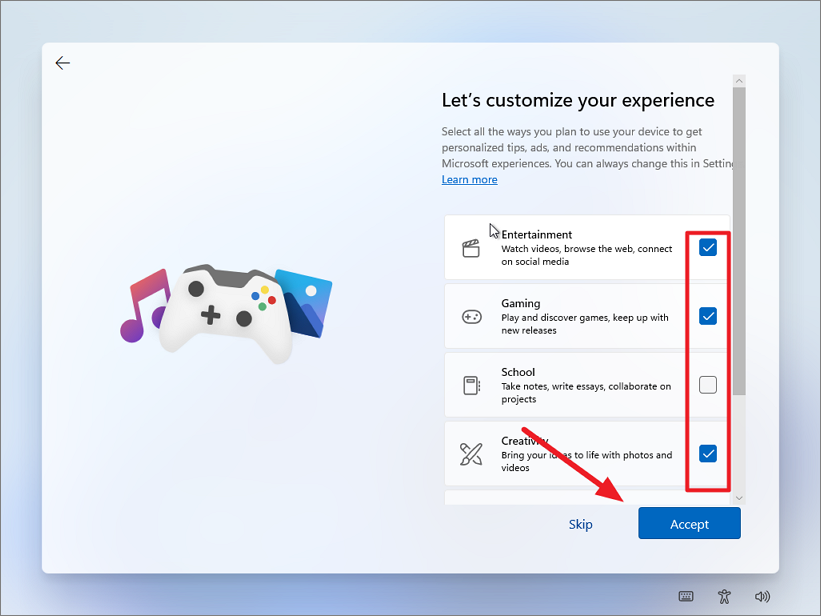Step 12: Select the primary use for your device to receive personalized tips and recommendations. Click 'Accept' to proceed.