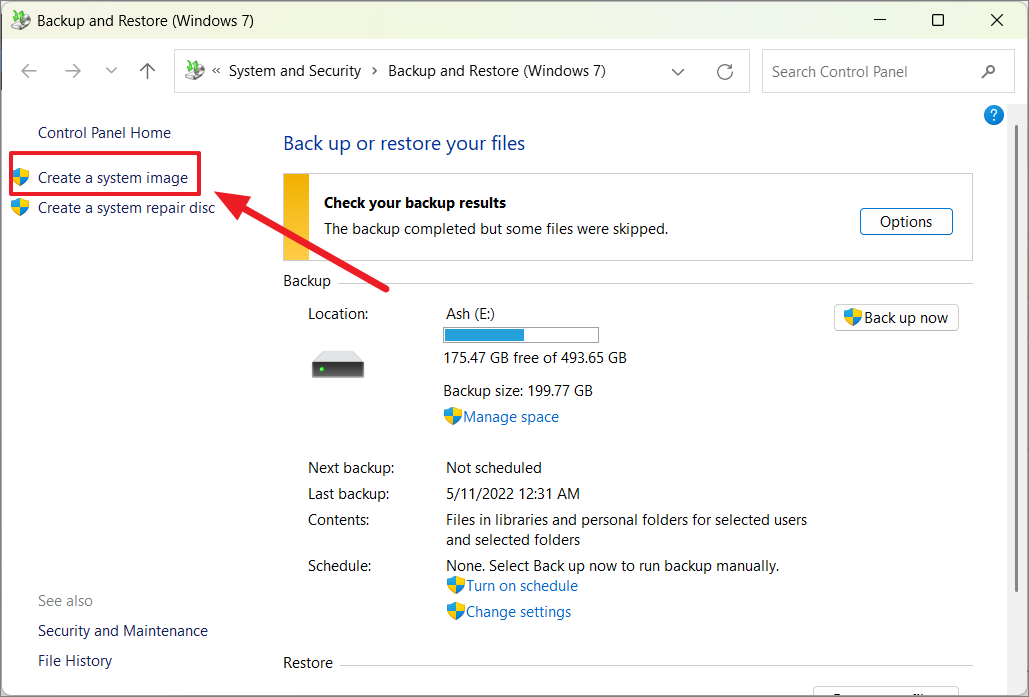 Step 3: In the Backup and Restore (Windows 7) window, select 'Create a system image' from the left pane.