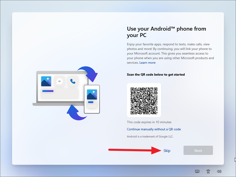 Step 13: If you wish to link your Android phone to your PC, scan the QR code provided. To skip this step, click 'Skip'.