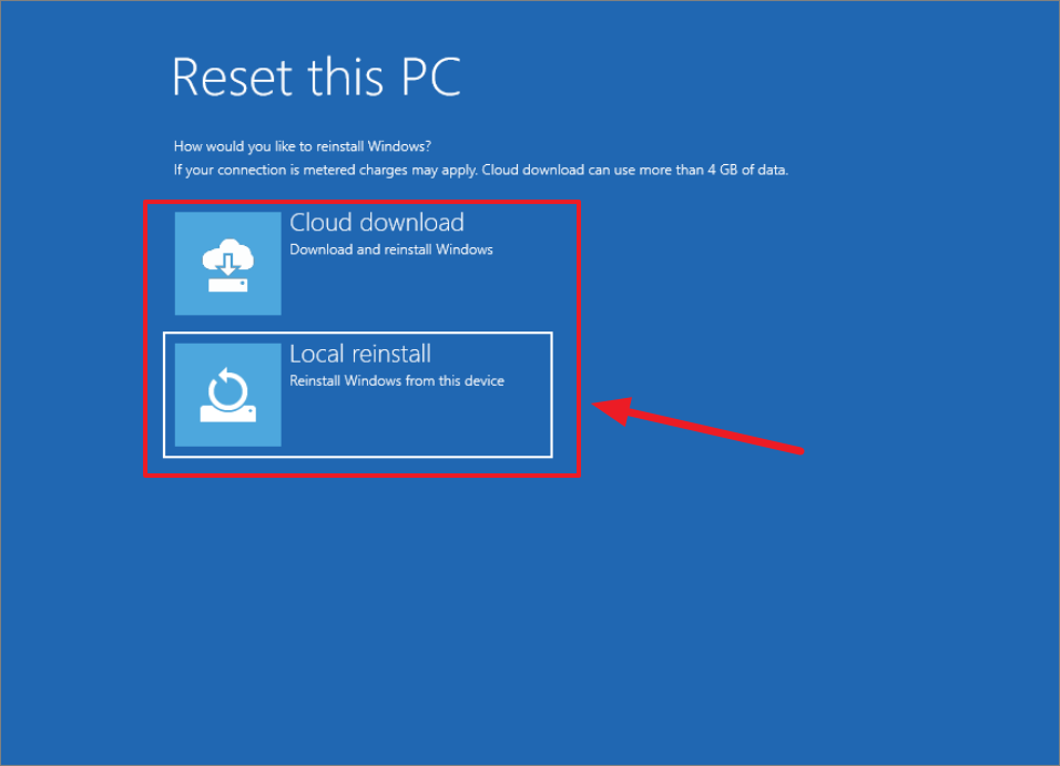 - Local reinstall: Reinstalls Windows from the existing system files on your PC.