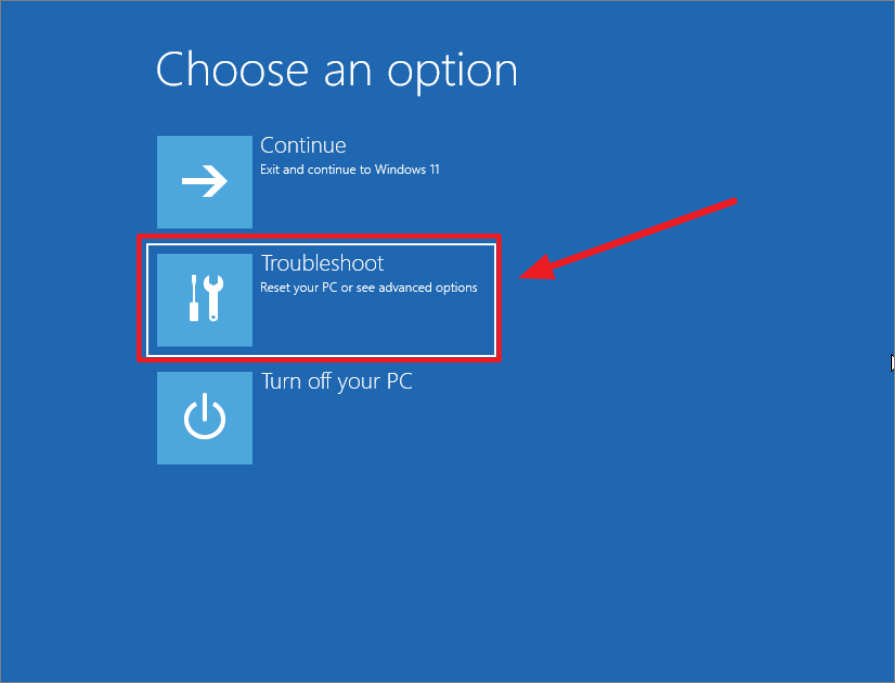 Step 2: In WinRE, click on 'Troubleshoot'.
